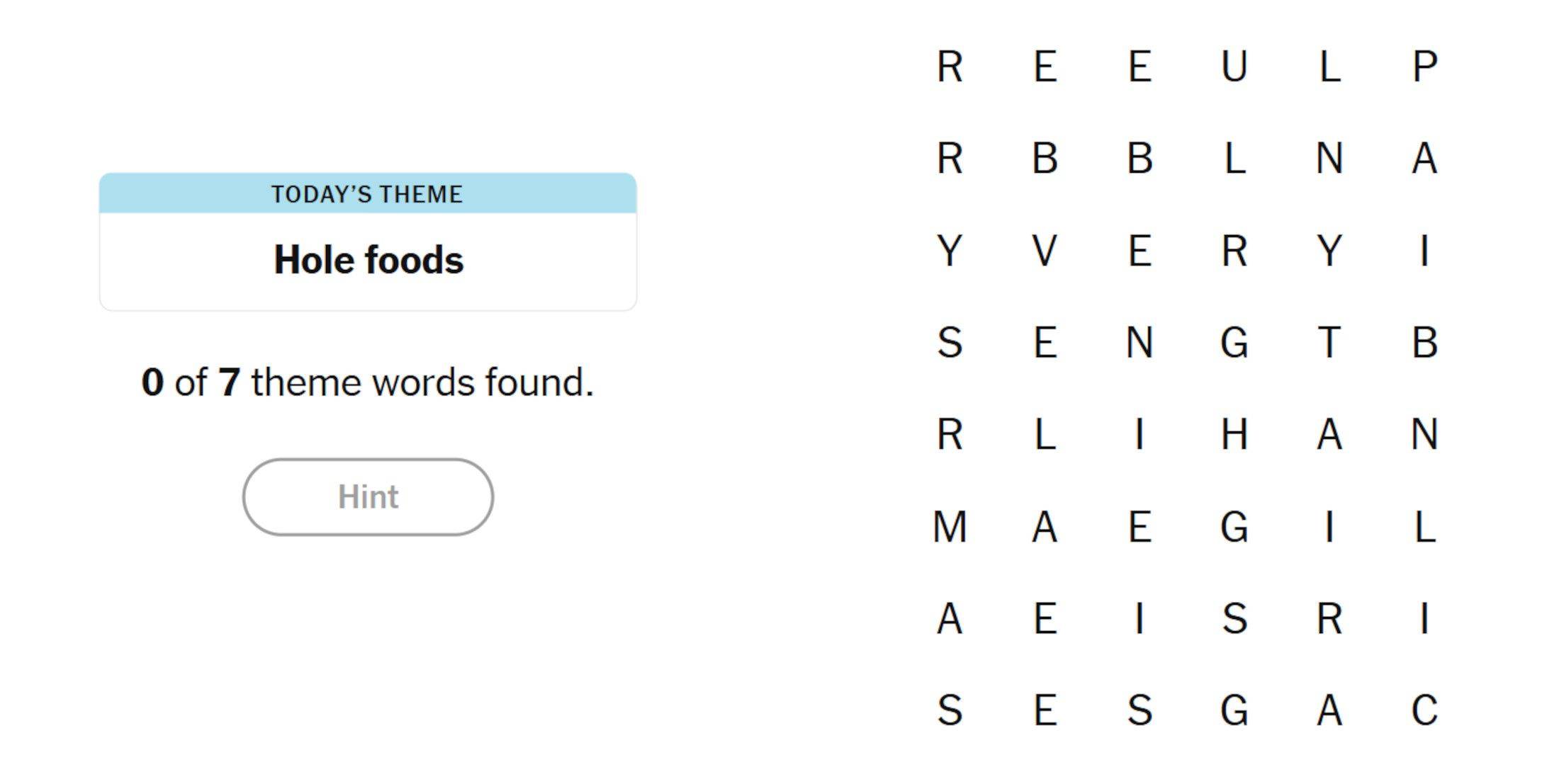 今日謎題主題為「洞洞食物」,玩家需找出包含關鍵詞「Spangram」及六個主題相關單詞的七項元素。